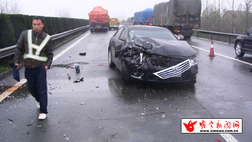 日前,京港澳高速公路江夏段發(fā)生一起嚴(yán)重交通事故:一輛豐田轎車(chē)因雨天側(cè)滑撞上中央隔離帶后,失控撞開(kāi)正在執(zhí)行施救作業(yè)的清障車(chē),并將一名施救工當(dāng)場(chǎng)撞暈。